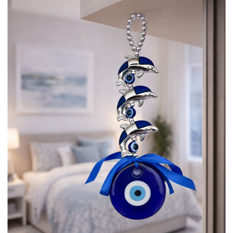 Add positivity and elegance to your space with this beautifully crafted Blue Evil Eye Dolphin Hanging. Designed with stylish silver-finish dolphin charms, blue evil eye beads, and a glossy round evil eye pendant, this decorative piece is believed to protect against negative energy and ward off bad vibes.